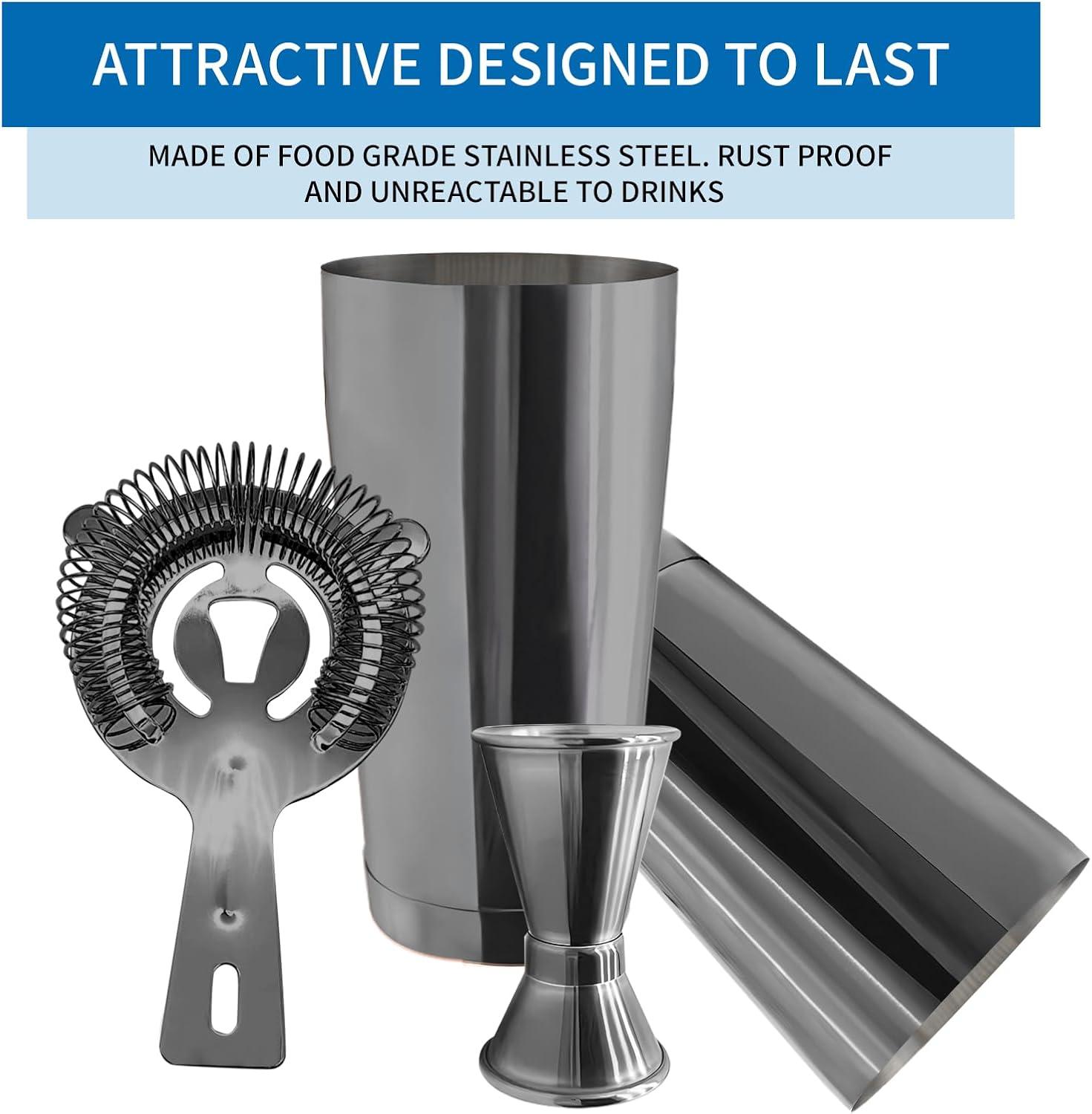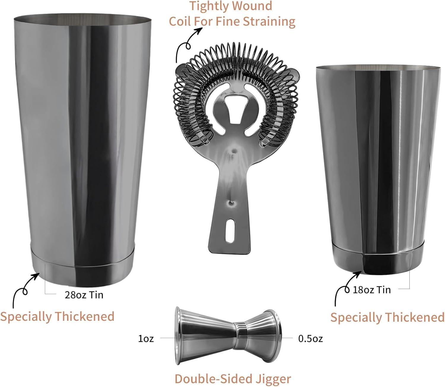 All in One Cocktail Shaker Set: Our 3pcs cocktail shaker set includes an enhanced 18/8 stainless steel 18 oz and 28 oz Boston shakers, a double size 1.0 / 0.5 oz Double Sided Jigger, a Hawthorne Strainer for all your incredibly tasty drinks.